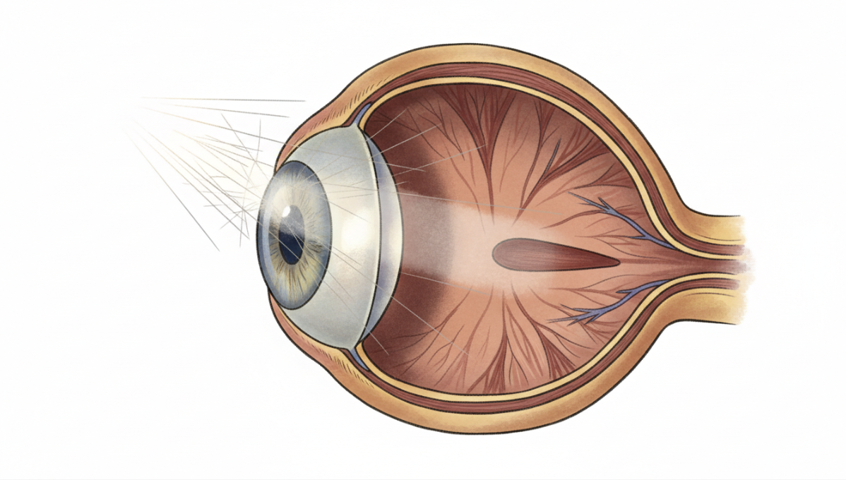 この濁りによって光が乱反射し、視界が白くかすんだり、まぶしさを感じたりします。さらに、濁った水晶体を通して見ようとすることで、目の筋肉が過度に働き続けることになるんです。