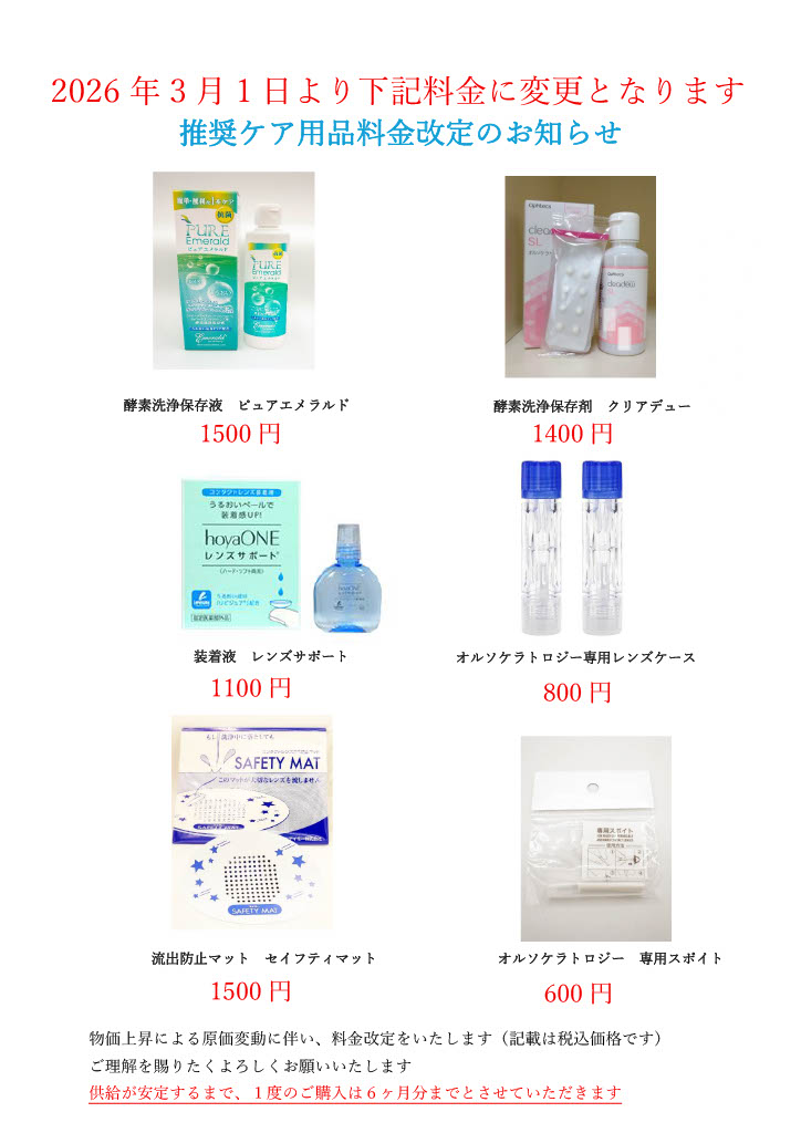 2026年3月1日よりオルソケラトロジーのケア用品が各種価格改定(値上げ)となります。